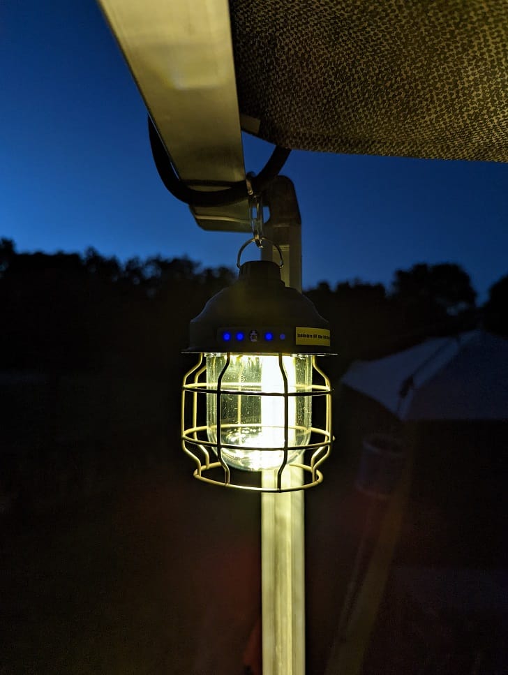Available in black or brown, Favorlite designed this lantern to have a vintage look with its wire basket. Underneath the hood is an LED bulb, so the light output can be quite high. You have three settings to choose from. On high, and while using the included carabiner hook, you could light up an entire area around an RV door. Or on low, and sitting on the picnic table, you could provide ambient lighting for your activities.