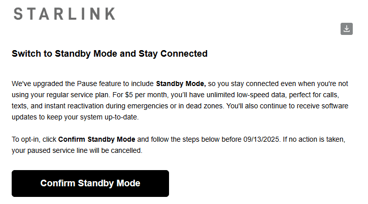 And now, the hate part of the love/hate intensified with Starlink’s announcement that the free “Pause” mode for their roaming service is becoming “Standby” mode that will cost $5 per month.